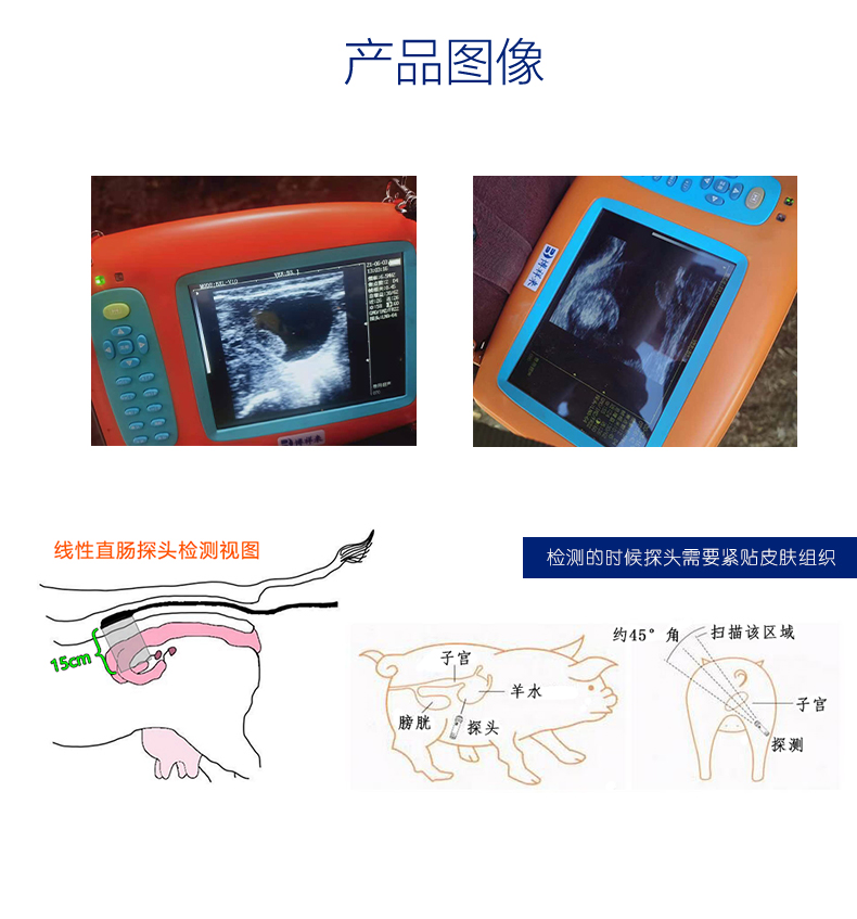 图像显示:大凸探头深度90-240mm 16档可调;直肠探头深度60-130mm 8档可调 图像可上/下、左/右,图像灰阶256 级,16种动物体标标记。